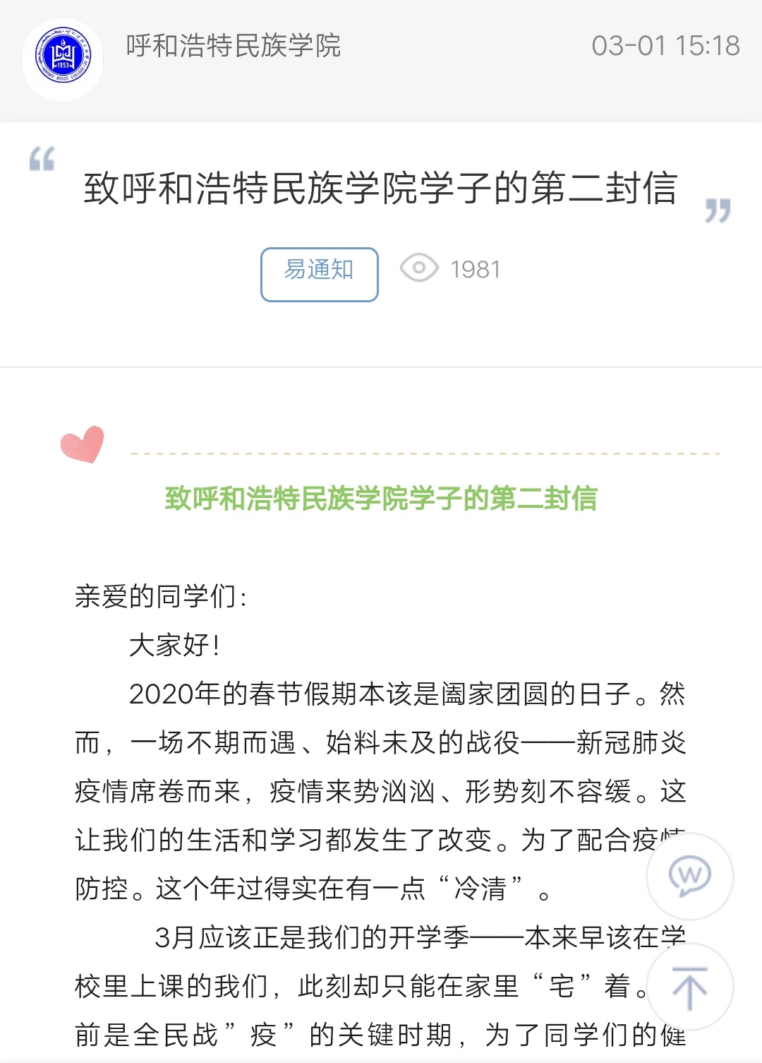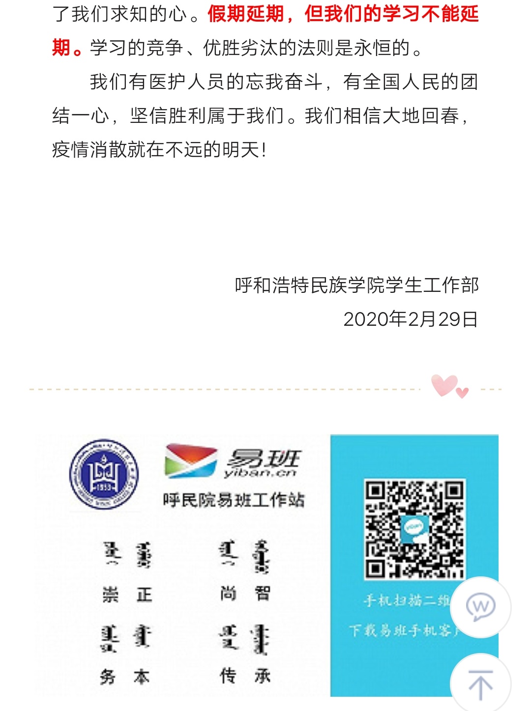 上一條:呼和浩特民族學院疫情防控期間學生臨時困難補助通知 下一條:致全校學生管理人員的一封信