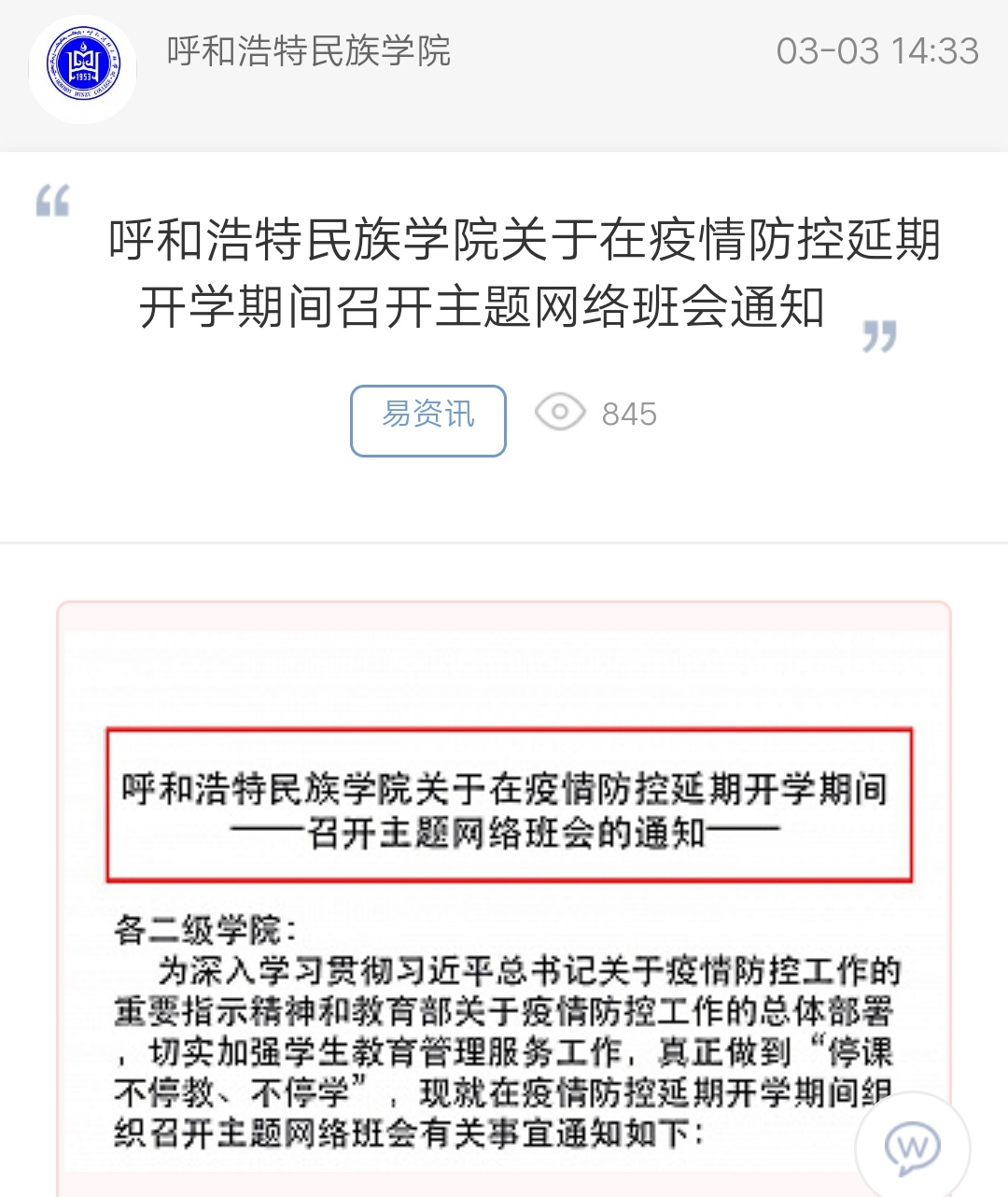 上一條:【戰(zhàn)“疫”有我——我行動(dòng)】上課了!呼和民院線上教學(xué)第一天 下一條:【“易”同抗“疫”】齊心協(xié)力,共抗“疫”情——新疆學(xué)子在行動(dòng)
