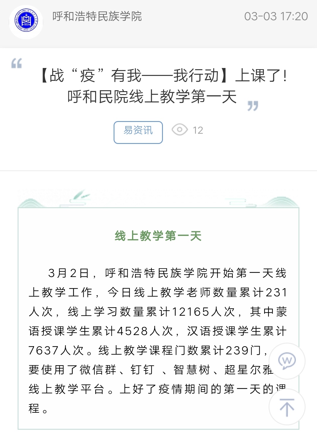 上一條:2020年呼和浩特民族學(xué)院蒙古語授課畢業(yè)生網(wǎng)絡(luò)視頻專場(chǎng)招聘會(huì)公告 下一條:呼和浩特民族學(xué)院關(guān)于在疫情防控延期開學(xué)期間召開主題網(wǎng)絡(luò)班會(huì)通知
