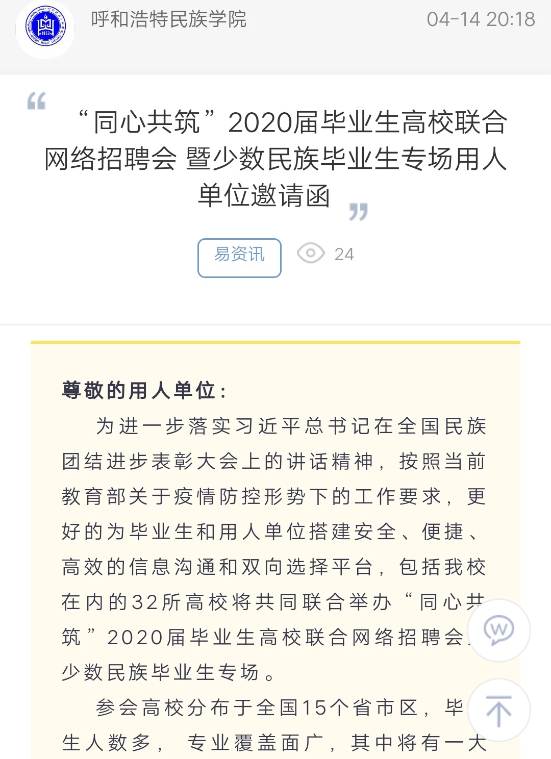 上一條:呼和浩特民族學院“一院一場”2020屆畢業(yè)生空中專場招聘會進行時 下一條:學生工作部組織全體輔導員參加全國高校輔導員網(wǎng)絡(luò)培訓示范班第三期直播答疑活動