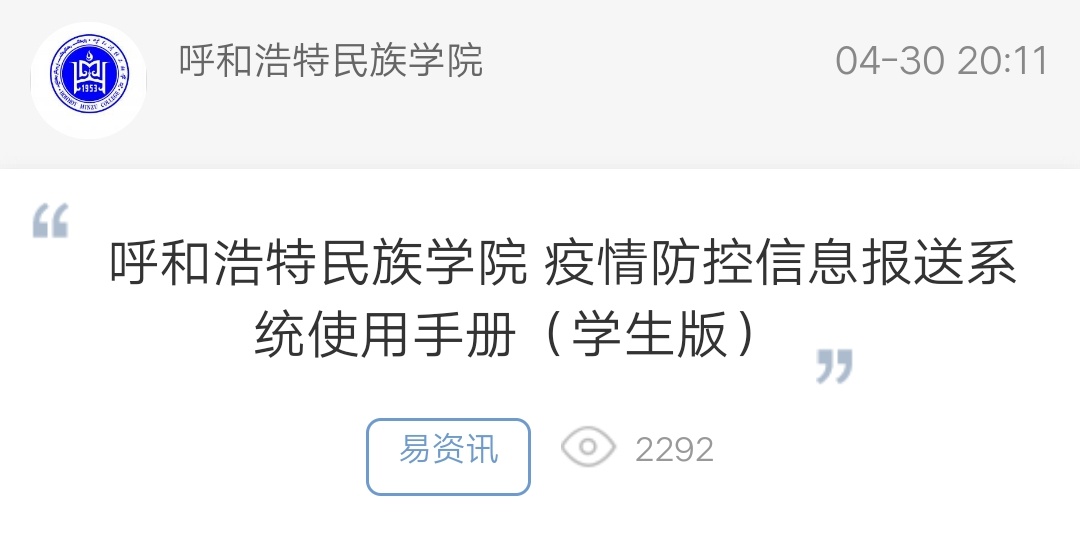 上一條:呼和民院版的“十二時辰”,我們這樣度過 下一條:呼和浩特民族學院 疫情防控信息報送系統使用手冊(教工版)