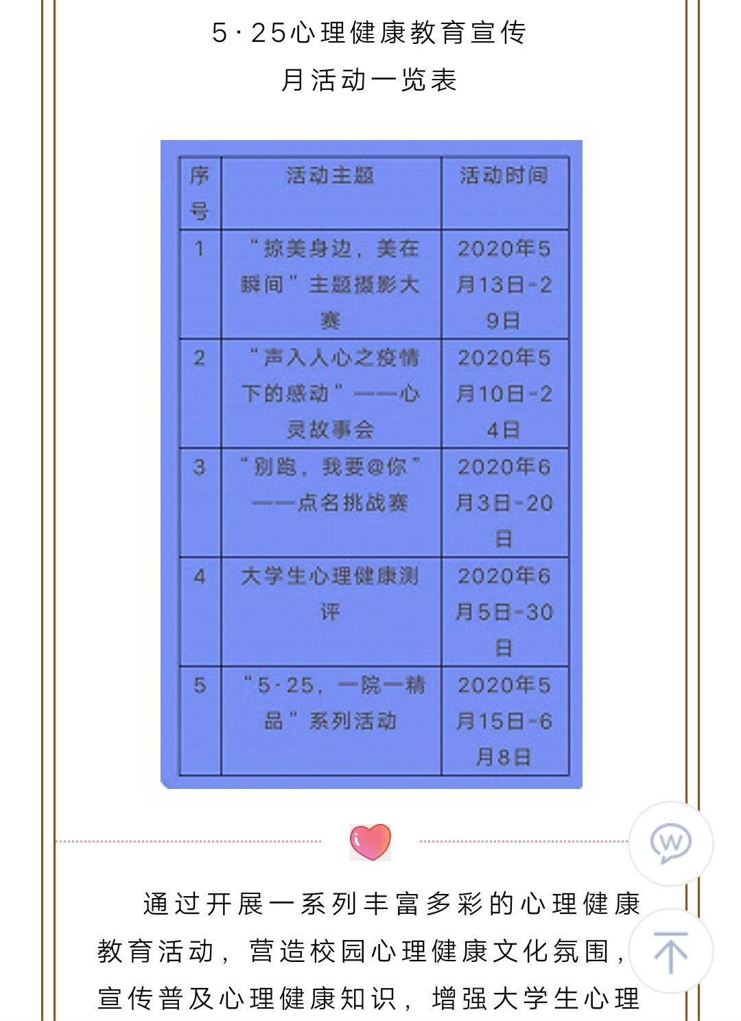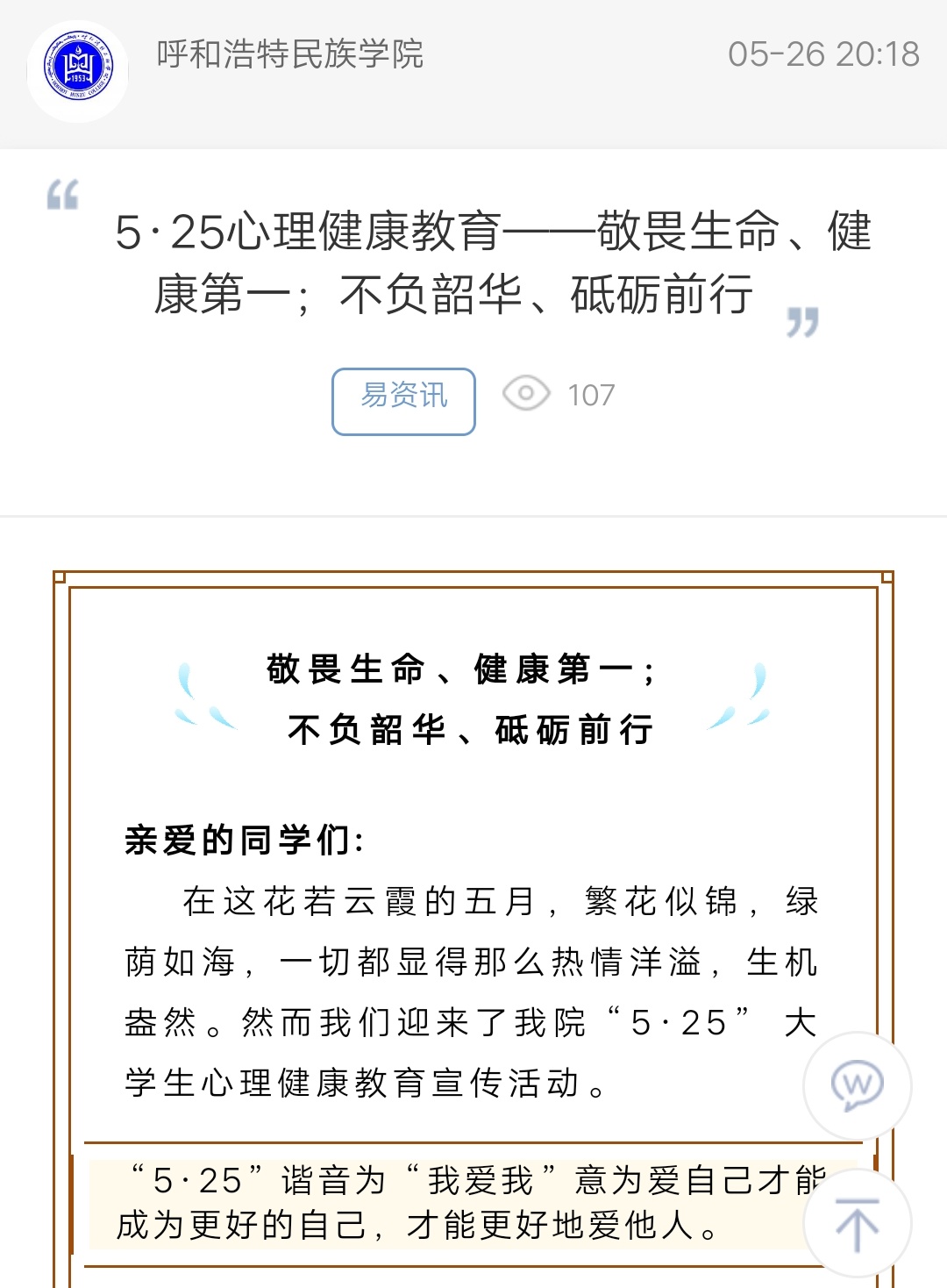 上一條:呼和浩特民族學院“5·25”大學生心理健康教育宣傳月活動倡議書 下一條:我校成功開展“5·25——心靈故事會”