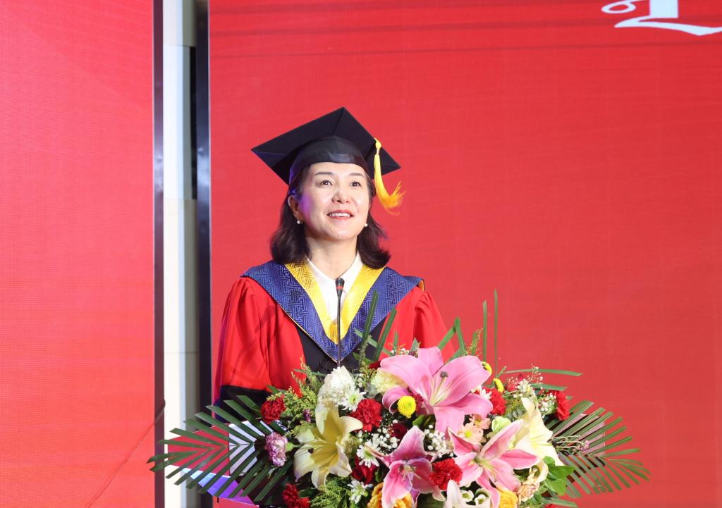 韓偉新在致辭中代表學校向圓滿完成學業,即將踏上人生新征程的2023屆全體畢業生表示熱烈的祝賀,向悉心培育同學們的老師和家長致以衷心的感謝。他勉勵同學們一要厚植愛國情懷,堅定信念、志存高遠,做新時代民族復興中勇往直前的筑夢人;二要錘煉實干之勇,腳踏實地、艱苦奮斗,做中國式現代化勇毅前行的建設者;三要擔當團結之責,愛我中華、守望相助,做鑄牢中華民族共同體意識的“播種者”和推動者。并祝愿所有畢業生此去繁花似錦,歸來仍是少年!