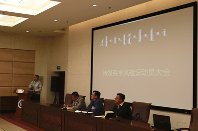 會上,首先由傳媒系黨總支書記宣讀《呼和浩特民族學院傳媒系學風建設實施方案》,并重點介紹了學風建設的思路和安排。隨后,我系學生代表畢力貢達來同學向全校學生提出倡議,他倡議同學們?nèi)硇耐度氲綄W風建設中,要積極響應學校開展的“全面深化學風建設”活動,以實際行動為學校發(fā)展做貢獻;畢業(yè)生代表道爾吉普日布從高年級學生的角度鼓勵在校大學生珍惜校園時光,多讀書多思考。教師代表斯日古楞也結(jié)合自身學習和工作實際進行了發(fā)言,他代表全體教師承諾將繼續(xù)在自己的崗位上做好自己本職工作,開拓進取,以優(yōu)異的成績迎接自治區(qū)成立70周年和黨的十九大勝利召開。