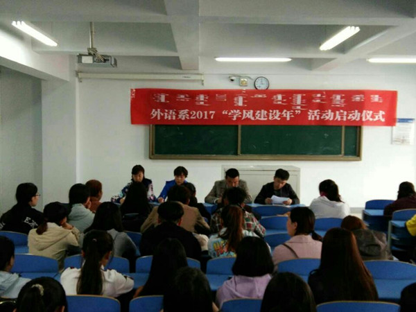 為進一步加強外語系學風建設,營造良好的學習氛圍,促進學生成長成才,外語系于4月17日下午在都林樓502教室舉行了“外語系2017學風建設年”活動啟動儀式。出席本次大會的有學生處副處長陳青春、黨總支副書記紅梅、團總支負責人王春梅老師、學生處韓爭運老師及外語系全體學生。