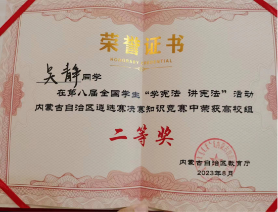 8月下旬舉行的由內(nèi)蒙古自治區(qū)教育廳主辦,內(nèi)蒙古大學(xué)承辦的的第八屆全國(guó)學(xué)生“學(xué)憲法 講憲法”活動(dòng)內(nèi)蒙古自治區(qū)遴選賽決賽落下帷幕,我校法學(xué)院2020級(jí)法學(xué)4班吳靜同學(xué)榮獲知識(shí)競(jìng)賽高校組二等獎(jiǎng)。