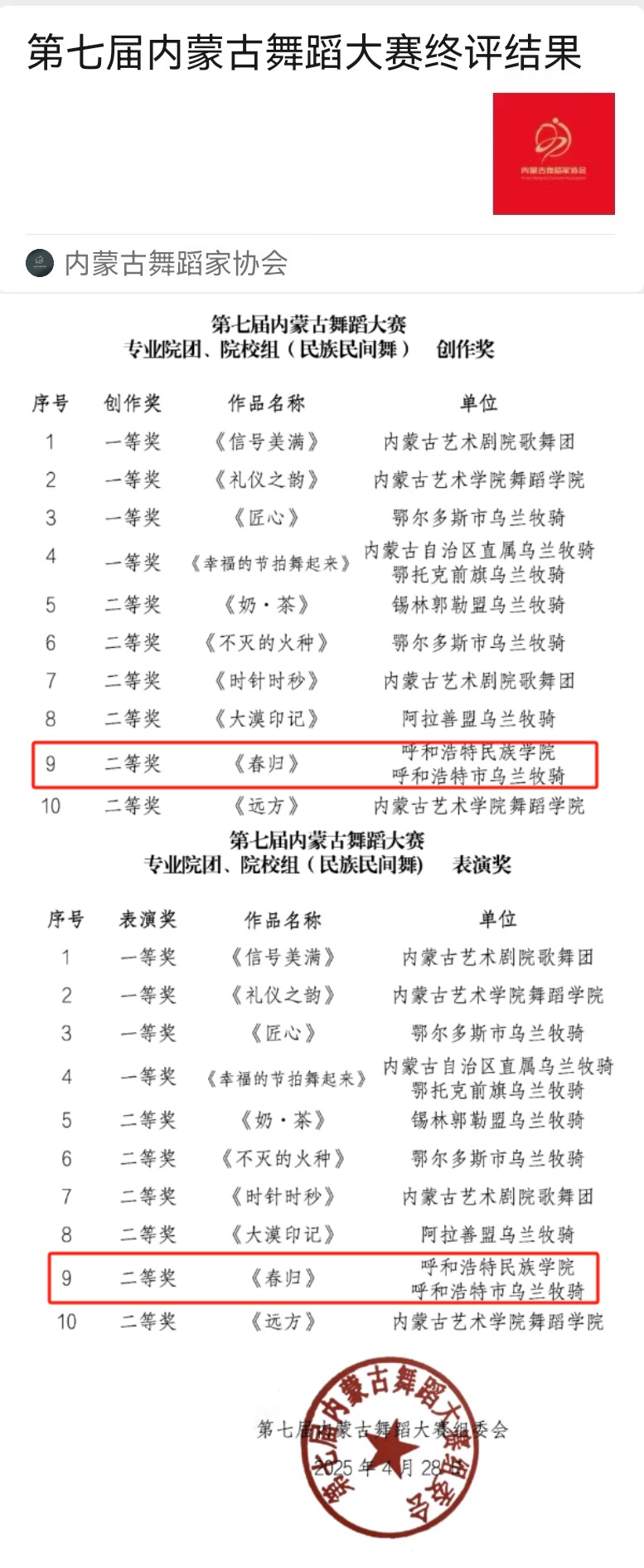 近日,內蒙古舞蹈家協會官方公眾平臺公布了由內蒙古自治區文學藝術界聯合會主辦,內蒙古舞蹈家協會承辦,內蒙古自治區直屬烏蘭牧騎和內蒙古自治區文化館協辦的第七屆內蒙古舞蹈大賽終評結果。我院舞蹈學專業首部原創舞蹈作品《春歸》獲專業院團、院校組(民族民間舞)創作類二等獎、表演類二等獎。該作品作為舞蹈學專業自2021年成立以來首個在省級賽事中入圍并獲獎的作品,標志著我院舞蹈學專業建設的歷史性突破。