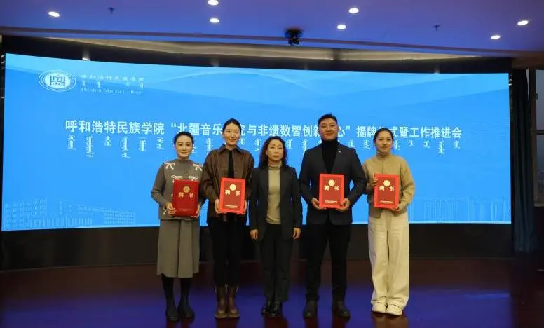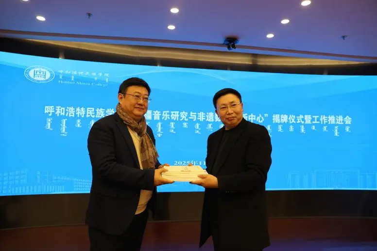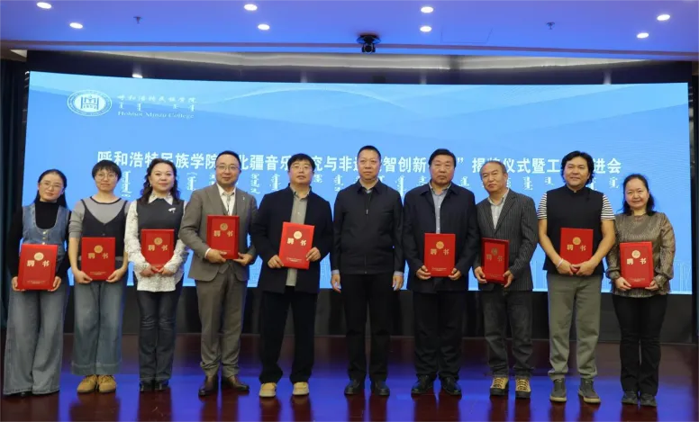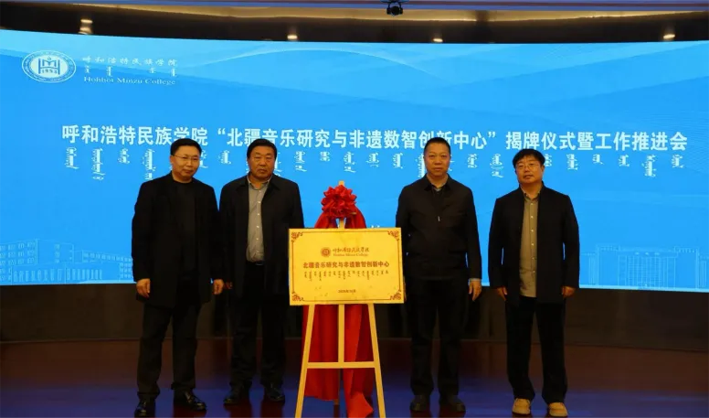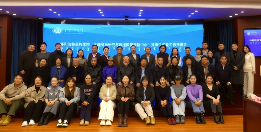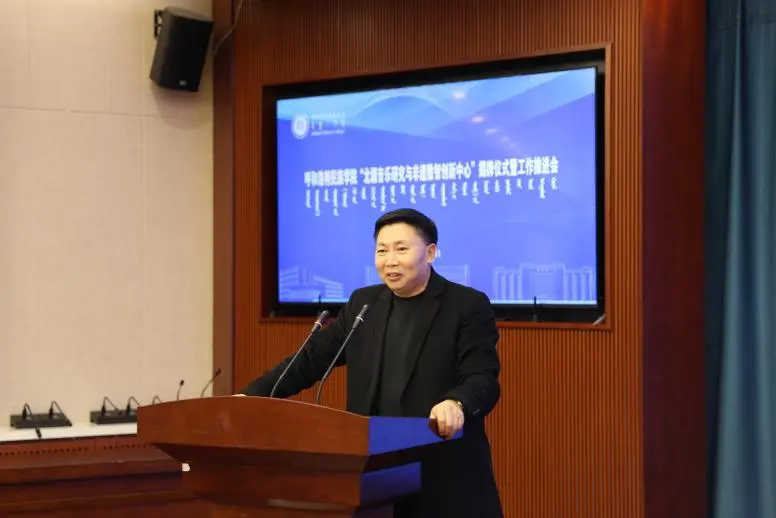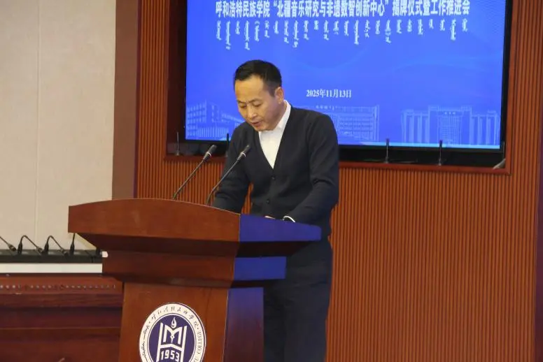 2025年11月13日下午,呼和浩特民族學院“北疆音樂研究與非遺數智創新中心”揭牌儀式及工作推進會在綜合樓1211(5號)會議室舉行。學校黨委委員、副校長雙虎,內蒙古自治區人大教科文衛委員會副主任委員吳海龍,內蒙古師范大學音樂學院楊玉成教授,江西科技師范大學音樂學院哈斯巴特爾教授等區內外專家、學者以及中國音樂學院、內蒙古師范大學、內蒙古藝術學院、呼和浩特民族學院音樂與舞蹈學院師生代表參加了會議。由音樂與舞蹈學院黨總支書記包玉柱主持。